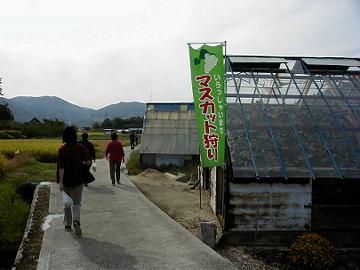 湯郷温泉を出て、南へ1時間ほど行ったところで下車。気持ちが高ぶる。農家のおっちゃんの説明に気もそぞろ‥。マスカットのあるビニルハウスまで急ぎ足。食べ放題だよ。ただし、一人一房だけ取って、食べるのはあっちだよ。おかわりのマスカットはこちらで用意してあるよ。だれも、2つ目を食べた人はいないよ。はーい!鋏は 15 人分だよ。はい!ここまで‥。