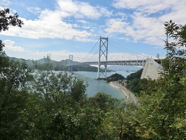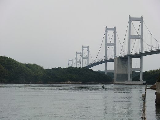 前回(1週間前)の続きです。因島大橋を渡るために、いきなり50m登るというわけですが、 遠回りをして登ったので、比較的楽でした。明石海峡大橋ができるまでは、世界最長の橋でした。
