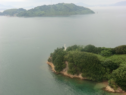 手前が馬島、向こうに見えるのが小島で、芸予要塞跡があることで知られています。何年か前に、小島に上陸して、要塞跡を見学しました。 その際に栗島海峡大橋の全貌を眺めました。