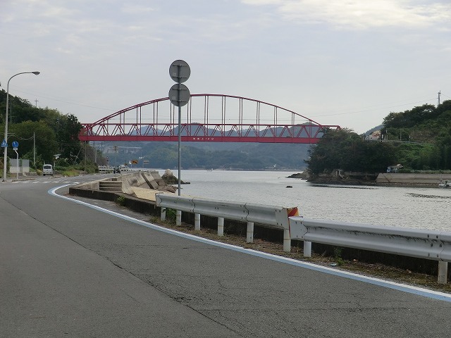向島(むかいしま)と岩子島(いわしじま)を結ぶ向島大橋。海面上14mと書いてありました。下を通る船のためです。