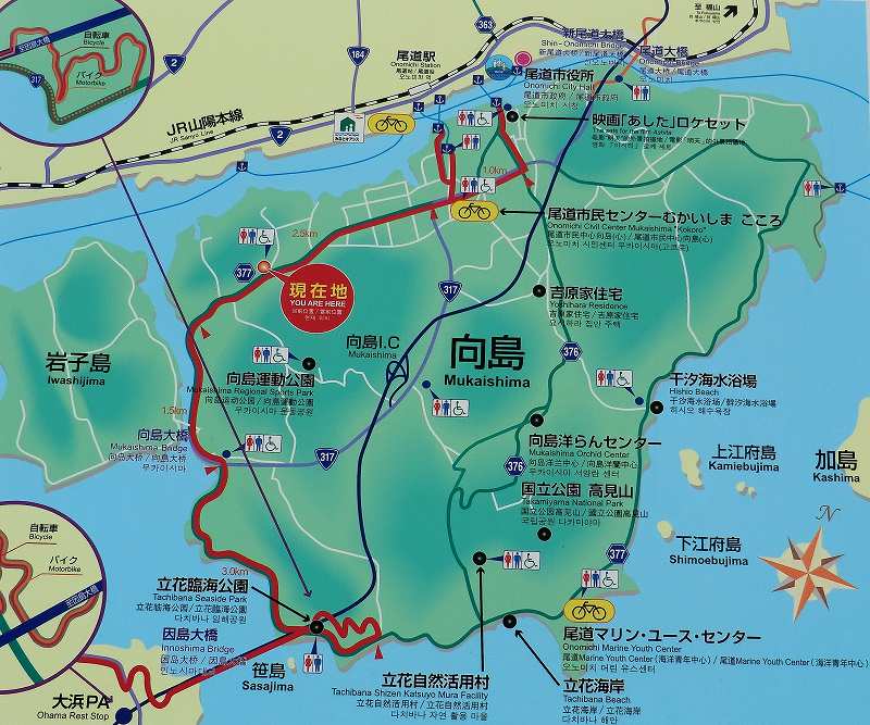 赤い線のところを歩きましたが、ほんの序の口ですね。「尾道市民センターむかいしま こころ」から立花臨海公園までのコースでした。高低差がなく、短い距離でした。