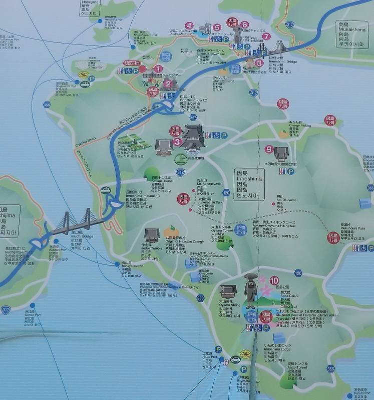 右上の向島の橋のしたにある立花臨海公園からスタートして因島大橋を渡りました。 あとは赤い道をたどって、最終的に次の生口橋の下まで歩きました。因島の中でも、2度高低差に苦しめられました。 言っておきますが、わたしは決定的に上りが苦手です。13kmは何度も歩いた距離ですが、ともかく上りと暑さには参りましたね。