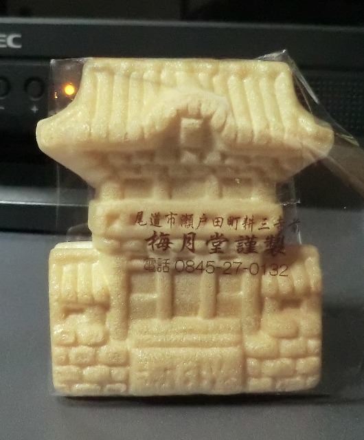 耕三寺の孝養門を模した最中です。レモン餡入りは既に食べました。これは普通の小倉餡入りです。