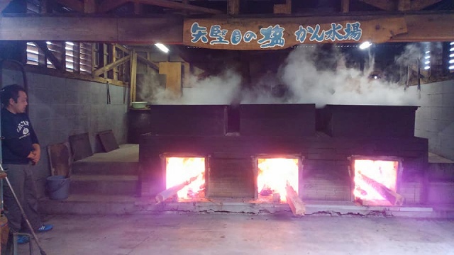 矢堅目(やがため)の塩作り。海水を煮詰めます。濃くなった塩水をかん水と言います。