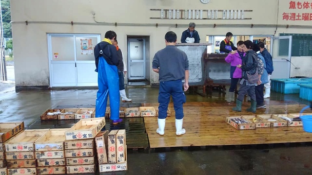水揚げ風景ではなく、魚市場の競りを見学しました。競り落とした者が札を投げ、司会役がそれを受け取るのが上手です。