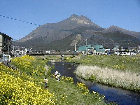 好きな写真です。 電線が見えるのが残念です。 由布岳を背景に河原の菜の花が見事でした。 もっとたくさん撮ったのですが 残念ながら、光の加減で没になってしまいました。