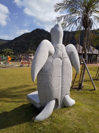ウミガメのモニュメントは、珍しい立ち姿でした。