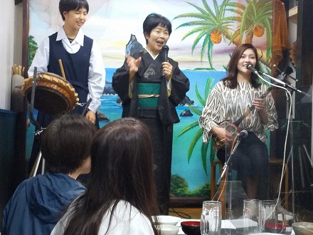 居酒屋の女将さんとお孫さんによる島唄ショーがありました。お客さんは一緒に歌い、最後は踊る羽目に。いやはやなんとも楽しいひとときを過ごすことができました。。