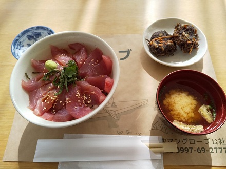 同じパーク内の店で、肉厚のマグロ丼を頂きました。右上はもずくの天ぷらです。