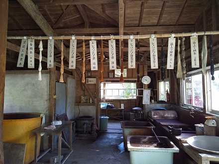 染織工房の中です。染めを交互に繰り返すことで、糸の色が変わっていくことを示しています。20回から80回も染めていくことで、独得の黒褐色の絹糸に染め上がります。