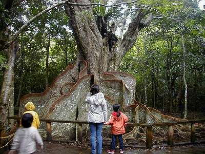 遊覧ボートの終点で降りて40mのところにある 天然記念物のサキシマスオーの木です。 昆布のような根っこの高さで樹齢を見るそうですが 樹齢は約400年だそうです。 |