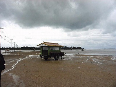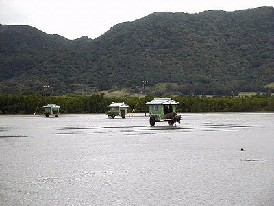 向こうに見える由布島まで水牛車に乗って渡ります。 とても浅いので、歩いて渡る人もいます。 由布島は周囲2.15kmの離れ小島です。 |
