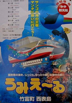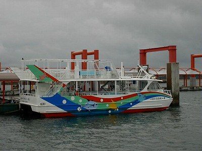 これが「うみえーる」船底から覗くグラスボートではなくて、船底より下につくった船室の窓から覗くタイプのようです。第3セクターの船会社が経営する船で、この10月に就航したばかりなので、 是非とも乗りたかったのですが、海が荒れるとさっぱりですね。 パナリ島(新城島)のさんご礁に向かうはずだったのです。 大原港に泊まっている、心もち寂しげな様子を撮りました。 この日は20度くらいでした。 |