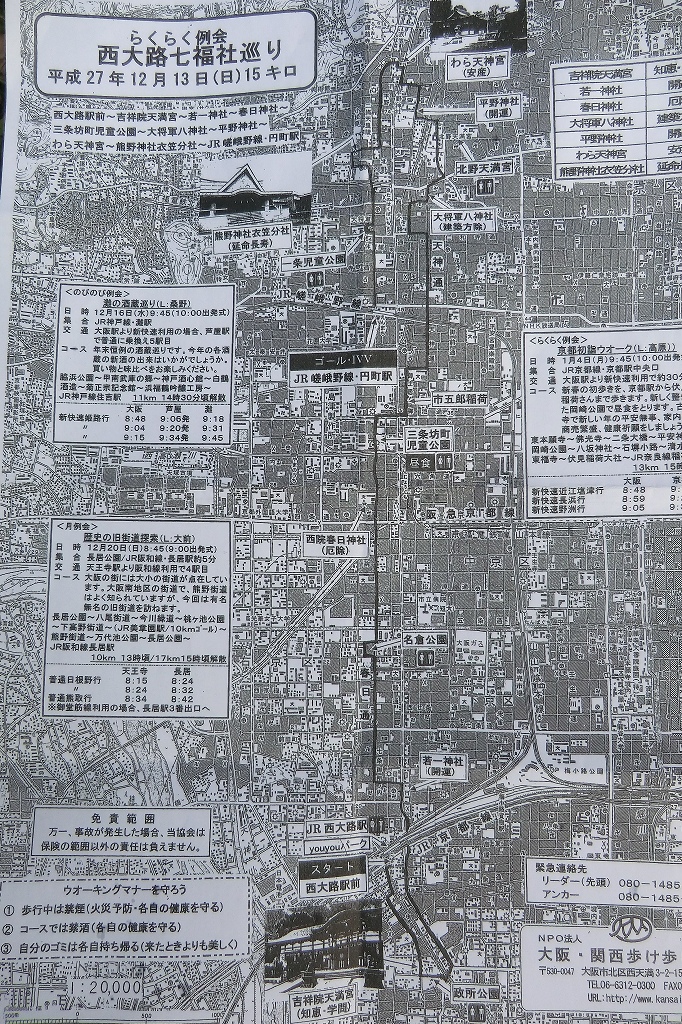 | 西大路七福社巡り15km 2015年12月13日 お日柄もよく、絶好のウォーク日和でした。 JR西大路駅から十条通りまで南下しました。それから九条、八条、七条と北上して、やがて数字が消え、「北野天満宮」や「平野神社」から「わら天神宮」まで行きました。 JR山陰本線(嵯峨野線ともいう)円町駅まで戻って、京都駅経由で帰阪しました。 言っておきますが、わたしどものウォーキング協会(大阪・関西歩け歩け協会)は、JRが好きです。 どれだけ遠征しても、私鉄に乗る必要はありません。乗ってもいいのですが‥。 「JRふれあいハイキング」とコラボしていて、10回ごとにバッジがもらえます。 それで、3種類の、同じバッジが貯まっています。 ![]() ![]() ![]() ![]() ![]() |