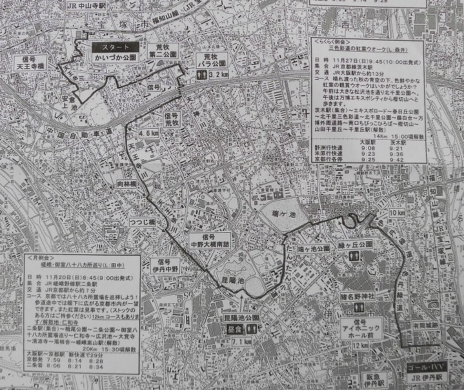 | [大阪・関西] ウォーク 13km 2016年10月23日 タイトルは「花いっぱい・バラ園から公園巡り」です。 JR「中山寺」駅(宝塚市)から JR「伊丹」駅まで歩きました。 大きな声では言えませんが、秋バラは余り好きではありません。 春バラが好きです。 昆陽池と瑞ケ池、緑ケ丘公園を結ぶ「たんたん小道」。なぜ、「たんたん」なのかは不明です。 決して淡々と歩くせいではないと思います。 緑と(今は流れていない)せせらぎが、心をウキウキとさせ、楽しませてくれる。 「たんたん」は、その喜びの表現だと思います。 ![]() 中国自動車道を過ぎて天王寺川沿いに歩いた道の東側が「鴻池」(1丁目から7丁目まである)でした。 かの鴻池家は、この伊丹市「鴻池」町(古くは摂津国鴻池村)出身です。 この鴻池村で酒造を行い、その後大坂に出て、両替商(豪商)として名を馳せたわけです。 |