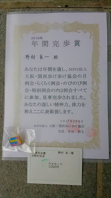 | 雨中のウォーク 2017年2月5日 本来は「城北公園から鯨橋瑞光寺」ですが、雨と寒さ(冷たさ)のせいで、豊里大橋の手前で2つに別れました。 JR「吹田」駅に向かうコースと地下鉄「太子橋今市」駅に向かうコースです。 城北公園で昼食休憩をとった際に体が冷え切ってしまったので、ここは無理をせず、地下鉄「太子橋今市」駅から帰宅することにしました。 それでも、(自宅と最寄りの駅を往復した分を含めれば)12kmありましたから十分です。 ![]() わたしは2例会の全てのコース(24回)を歩いたということで表彰して頂きました。 例年であれば10回ほどの参加だったのが、昨年は36回の参加ですから(わたくし的には)立派なものですが、残念ながら1回の欠席で1ランク下がってしまいました。 まだまだひよっこでございますので、無理をせず、精進しますとも。 |