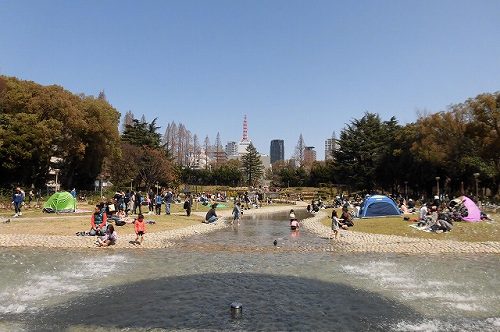 靱公園のほぼ真ん中。バラ園界隈では、子どもたちが水遊びの真っ最中。