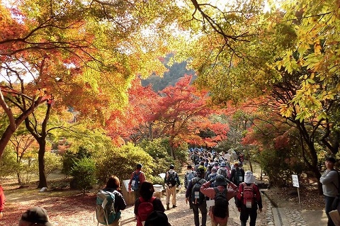 | 大阪・関西ウォーク12km 2018年11月21日 紅葉の嵐山に向かっています。今は昼めしどき。 予定通り、あとで写真の追加&削除をしました。 ちょっと時期が遅かったので、「見頃」を過ぎていたように思います。 そういうときは、森(全体)を見ずに木(部分)を見ます。 表よりも裏から見ることがしばしばです。 なお、このコースを歩くのは2度目なり。 ![]() ![]() ![]() ![]() 嵯峨野までやって来ました。二尊院も、わたしの好きな常寂光寺もカットして、ひたすら通り過ぎます。 ![]() 嵐山展望台まで来て、ようやく休憩です。これは、櫨(はぜ)です。いつも真っ赤に紅葉するので見応えがあります。 ![]() 展望台の下り坂でみた紅葉が、この日一番の出来だったように思います。 |