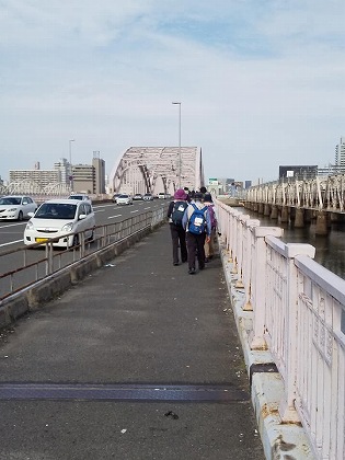 | 茶屋町から大野川緑陰道へ 2020年10月28日 関西w 12km+おまけ(2km) ![]() ![]() ![]() 阪急「中津」駅辺りから梅田スカイビルを眺める。道路を走り去る車が写っているのはわたしのせいです。 ![]() 十三小橋 ( 54.23m ) を渡り始めた辺りで阪急電車を眺める。 長柄運河と呼ばれる人工河川を越えるための橋ですが、今では長柄運河が埋め立てられてしまい、不要のものとなっています。と言っても、新淀川に架かる十三大橋と一体のものですから、撤去するわけにはいかないようです。気にしなければ気にならないのですが、私は気になります。 ![]() 十三大橋はかなり長い。長さが683.2mもある。考えてみると近くの大和川に架かる橋の長さが約200mですから、違いははっきりしています。 ![]() ![]() ![]() 大野川というのが流れていた跡地です。 ![]() 快適に歩いています。実は、暑いです。左下の怪しげな白いものは、お仲間の右手です。 |