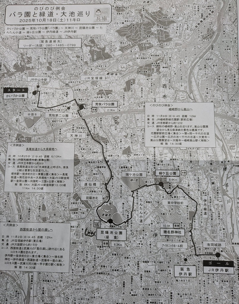 | バラ園と緑道・大池巡り 2025年10月18日 のびのび例会 バラ園と緑道・大池巡り 中山寺駅 (宝塚市) から荒牧バラ園 (伊丹市) 、昆陽池 (伊丹市) 、本来ならJR伊丹駅 (本日は阪急伊丹駅) までの、よく歩いたコースでした。 断続的に雨が降り、昼時にはしっかり雨が降りました。嬉しいことに昆陽池センターを利用できたので、ゆっくり昼食休憩がとれたのが幸いでした。 昼食後にショートカットあるも、1km削減に留まりました。 10km+おまけ(4km) ![]() ![]() ![]() ![]() 振り返っているところ。。 ![]() ![]() ![]() ![]() 大谷くんの3本のホームランが、話題になりました。。 ![]() 塚口で乗り換えて、梅田まで。。 今晩は淀川花火の日。梅田界隈で、着物姿の女性を見かけました。 |