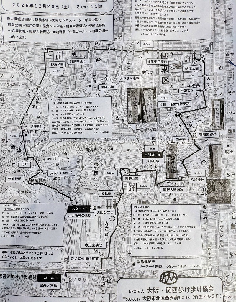 | 大阪の陣の古戦場巡り 2025年12月20日 のびのび例会 大阪の陣の古戦場巡り JR大阪城公園・駅前広場〜都島公園〜鯰江公園(昼食)〜今福・蒲生古戦場跡〜八剱神社・鴫野古戦場跡〜JR鴫野駅(中間ゴール)〜回り道をして孫娘宅へ この時期に20℃超えには呆れるというか、疲れました。 中間ゴール8km+おまけ(6km) ![]() ![]() ![]() ![]() ![]() 鴫野合戦四百年記念 大阪冬の陣 ![]() ![]() |