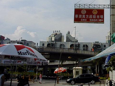 ↑ 写真は、自由市場の2楼(2階)にある超級市場の看板と「Marlboro」の文字の入った日除け傘 (香港に隣接する経済特区:シェンチェン) なお、最も一般的な煙草「Marlboro」の箱には「吸煙引致呼吸系統疾病」(特区政府忠告市民)とある。