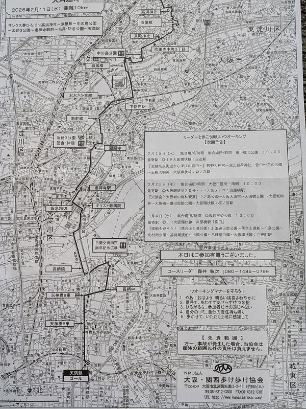 | 淀川チャレンジウオーク 12km 2026年2月21日 月例会 「淀川チャレンジウオーク」 12km+おまけ(5km) = 17km かつては22kmにチャレンジしていましたが、お仲間がいなくなったときから無難に12kmとなりました。 ![]() ![]() ![]() ![]() ![]() ![]() ![]() 写真を撮りながら歩くと、たいてい集団の後ろを歩くことになります。 ![]() 「おおさか東線」が通るようになってからは人が渡れなくなりました。 ![]() ![]() ![]() ![]() 大和川の水量の無さから見ると、羨ましい限りです。 ![]() ![]() 菅原城北大橋とワンドを見ながら、あと4.5kmを歩きます。 先に出発した22kmテームが追いつき、追い越して行きました。 (なんと、食事抜きで歩いてきたようです。それだけは避けたいものなり。) ![]() |